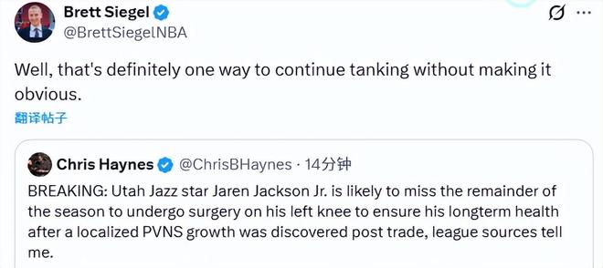 名記Haynes表示,小賈倫-杰克遜可能因此賽季報銷。Siegel轉發(fā)并寫道:“行吧,這絕對是一種不那么露骨、卻能安心擺爛的辦法。”