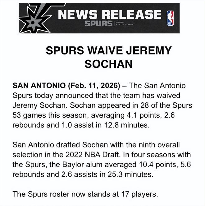 北京時間2月12日,圣安東尼奧馬刺隊官方宣布,球隊已裁掉杰里米-索漢。本賽季,索漢代表馬刺出戰了53場比賽中的28場,場均登場12.8分鐘,得到4.1分、2.6個籃板和1.0次助攻。
